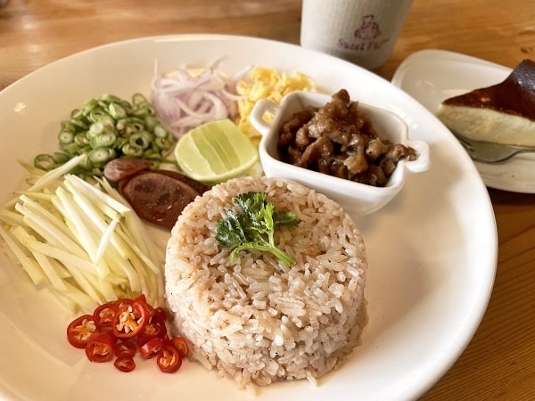 カオクルックカピは、お皿にのせられている野菜やお肉などの具をすべてごちゃ混ぜにして食べるタイ料理。
